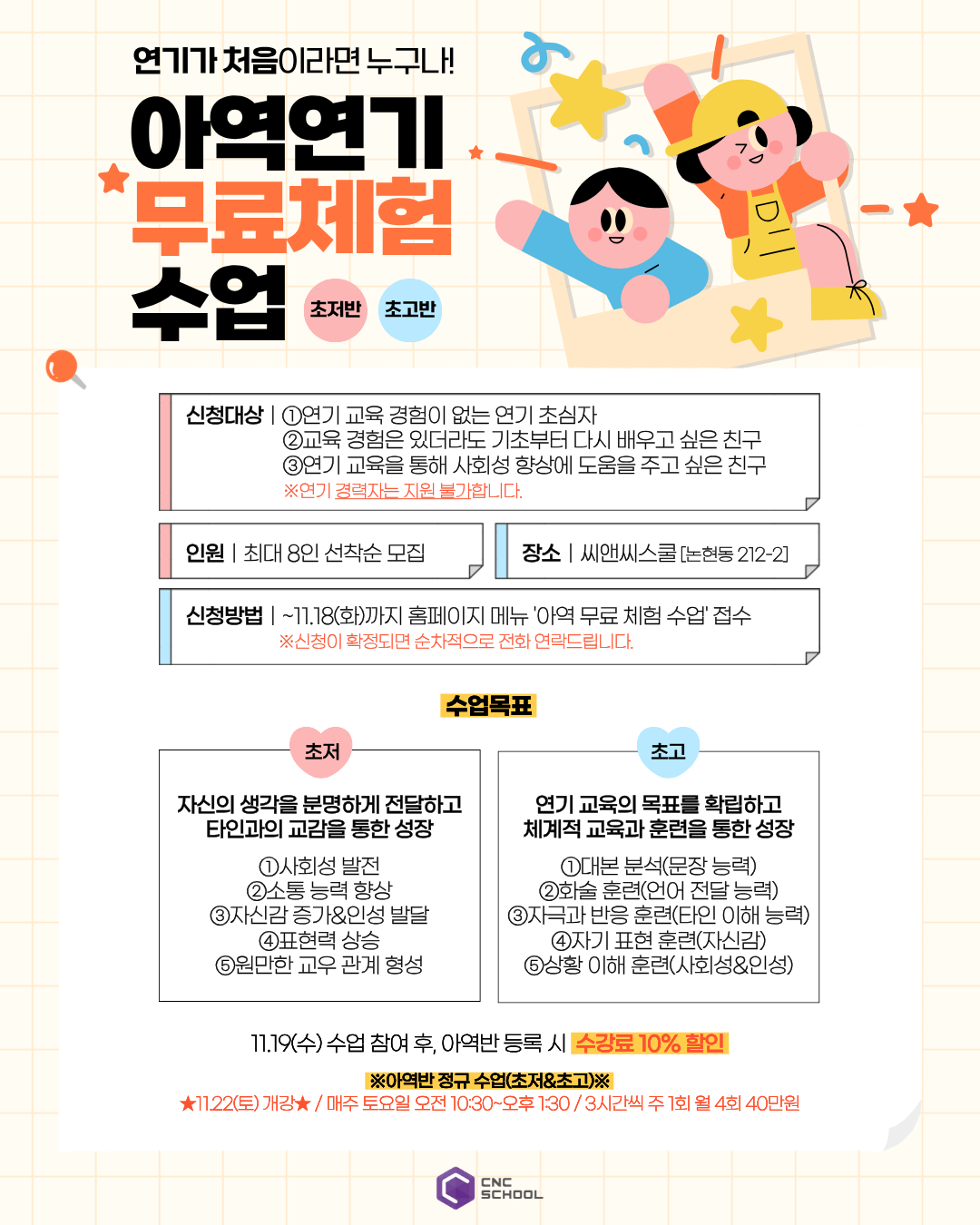 연기 기초·입문 무료 체험 수업을 진행합니다.
