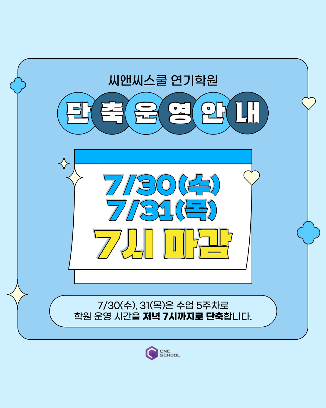씨앤씨스쿨 연기학원|단축 운영 안내오늘(7/30), 내일(7/31)은 수업 5주차로학원 운영 시간을 저녁 7시까지로 단축합니다.7시 이후에는 전화 문의가 원활하지 않을 수 있으니홈페이지 온라인 문의를 이용해주시기 바랍니다.
